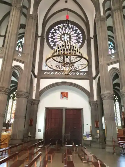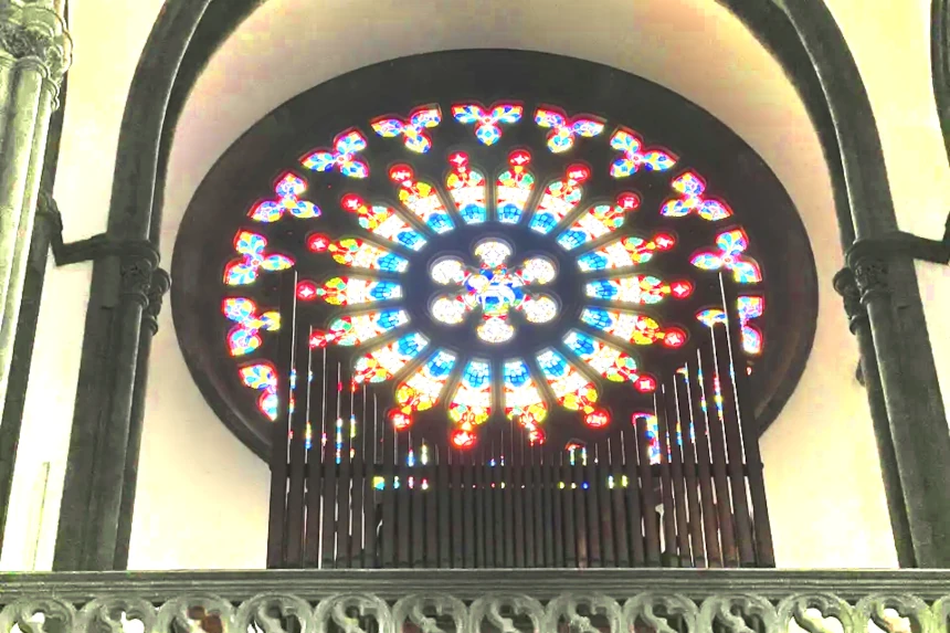 Above the Entrance is a beautifull Stained Glass Rose Window.