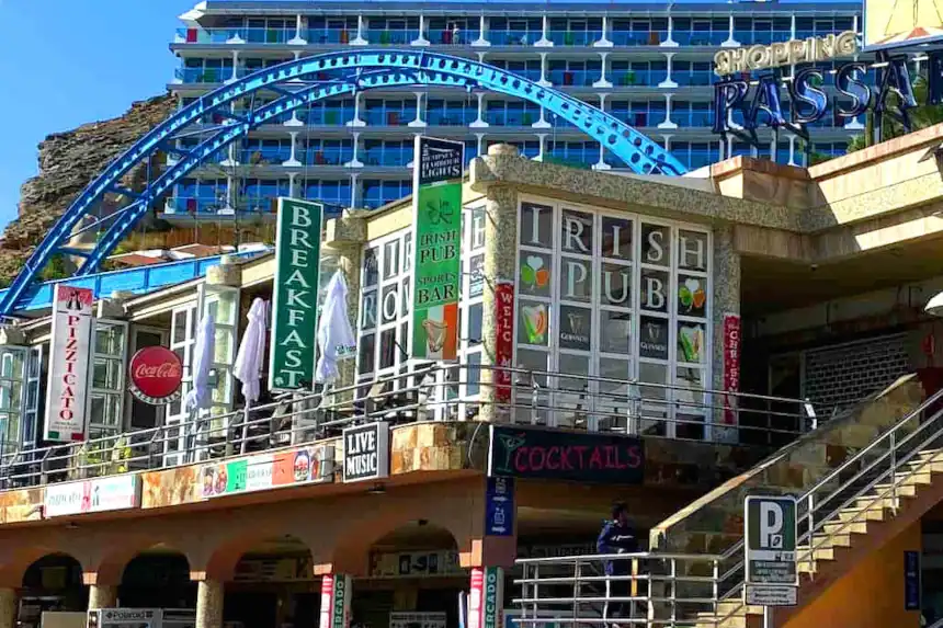 Pasarela Shopping Centre near the Western Marina under the Cliffs and Main road and also along the sea front behind the 2 marinas and beach. Only 1 bar, The Harbour Lights Irish Bar.